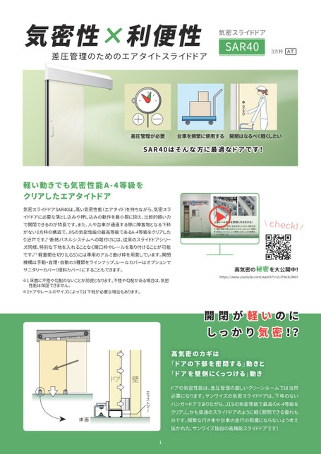 軽い動きでも気密性能A-4等級をクリアしたエアタイトドア差圧管理のためのエアタイトスライドドア気密スライドドアSAR40は、高い気密性能(エアタイト)を持ちながら、気密スライドドアに必要な落とし込みや押し込みの動作を最小限に抑え、比較的軽い力で開閉できるのが特長です。また、人や台車が通過する際に障害物となる下枠がない3方枠の構造で、JISの気密性能の最高等級であるA-4等級をクリアした引き戸です。※1断熱パネルシステムへの取付けには、従来のスライドドアシリーズ同様、特別な下地を入れることなく開口枠やレールを取り付けることが可能です。※2軽量間仕切り(LGS)には専用のアルミ曲げ枠を用意しています。開閉機構は手動・自閉・自動の3種類をラインナップ。レールカバーはオプションでサニタリーカバー(傾斜カバー)にすることもできます。気密スライドドア気密性×利便性※1床面に不陸や勾配のないことが前提となります。不陸や勾配がある場合は、気密性能は保証できません。※2ドアやレールのサイズによっては下地が必要な場合もあります。AT3方枠SAR40高気密の秘密を大公開中!\check!/https://www.youtube.com/watch?v=2LPHA3LlMdY台車を頻繁に使用する開閉はなるべく軽くしたい差圧管理が必要SAR40はそんな方に最適なドアです!ドア壁床面エラストマー開閉が軽いのにしっかり気密!?ドアの気密性能は、差圧管理の厳しいクリーンルームでは当然必要になります。サンワイズの気密スライドドアは、下枠のないハンガードアでありながら、JISの気密等級で最高のA-4等級をクリア。しかも普通のスライドドアのように軽く開閉できる優れものです。頻繁な行き来や台車の走行の邪魔にならないよう考え抜かれた、サンワイズ独自の高機能スライドドアです!高気密のカギは「ドアの下部を密閉する」動きと「ドアを壁側にくっつける」動き1