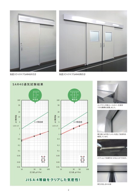メンテナンス用にレールカバーを保持できる機構を装備しました。開口部には中空パッキンを回して気密性を確保しています。オプションで沓摺りをつけることができます。気密スライドドアSAR40片引き気密スライドドアSAR40両引きA-4等級線103050100通気量(㎥/h・㎡)圧力差P(Pa)1005020105210.50.20.020.10.050.01正圧負圧qA-4等級線正圧負圧通気量(㎥/h・㎡)圧力差P(Pa)1005020105210.50.10.050.011030501000.20.02qSAR40通気試験結果JISA-4等級をクリアした気密性!片引き両引き両引き召し合わせ部2
