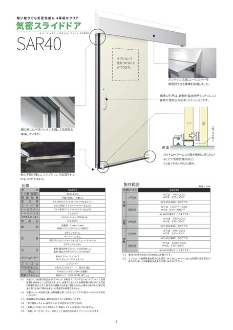 仕様SAR4041㎜(47㎜)手動・自閉※1・自動※2アルミ形材(アルマイト・クリアー仕上げ)※3アルミ形材(アルマイト・クリアー仕上げ)アルミ形材金属板0.4㎜~0.6㎜(鋼板・アルミ・ステンレス・支給材)スチレンフォームペーパーハニカム不燃ポリスチレンフォームまたはフェノールフォームセラミックハニカム表側:露出持手(ステンレスSUS304)※6裏側:埋込み引手(ステンレスSUS304)取付けステー:ステンレスガイドブロック:ポリアセタールエラストマー美和ロックUD錠(引残し有り)※5片引き:エラストマー・両引き:塩ビFX40(シングル)・FW40(複層)型式ドア厚(総厚)開閉形態開口枠エッジ材アルミ形材(アルマイト・クリアー仕上げ)アルミ形材レールカバーレールベースベロゴムパッキン:EPDMゴムベロゴムパッキン骨組み面材芯材引手ガイドローラーズレゴム錠前システム※4戸先安全ゴム窓※4※1両引きには自閉の設定はありませんが、手動をアシストするためにオプションで自閉装置を組み込むことは可能です。また、自閉式であっても自閉装置は室内外の気圧差の影響を受けやすく、施工時の調整でも完全に閉まりきらない場合があります。扉が完全に閉じきるまで閉め込まないと気密性を発揮できません。※2自動は、ハシダ技研工業、扶桑電機工業、フルテック、ナブコの各メーカーにのみ対応しています。※3軽量間仕切りの場合、開口部にはアルミ化粧材がつきます。※4「窓」「錠前システム」はオプションで追加することができます。※5「自動」につきましては、原則として「錠前システム」は対応しておりません。※6「自動」につきましては、原則として表側の引手はオプションになります。SAR40製作範囲枠開口寸法単位=mm片引きW寸法700~2000H寸法630~3000・W:Hの比率は1:3までです。両引き・W:Hの比率は1:1.5までです。片引き・W:Hの比率は1:3までです。片引き・W:Hの比率は1:3までです。両引き・W:Hの比率は1:1.5までです。SAR40W寸法1300※1~3000H寸法630~3000※2W寸法700~2000H寸法630~2500W寸法700~2000H寸法630~3000W寸法1400~3000H寸法630~3000※1錠付きの場合はW1400㎜以上が最少です。※2オプションで自閉装置を組み込む場合、W寸法によってH寸法にも制限が出る場合があります。詳しくは営業担当者までお問い合わせください。気密スライドドアSAR40軽い動きでも気密性能A-4等級をクリアAir-tightslidingdoorSAR40SAR4080レール長さL=(2WW(枠開口寸法)41パネル開口W(枠開口寸法)30DW=(W+50+A)A※シリンダー※自動ドア気密スライドドアSAR40差圧管理に最適!メンテナンス用にレールカバーを開保持できる機構を装備しました。開口部には中空パッキンを回して気密性を確保しています。オプションで窓をつけることができます。標準の引手は、表側が露出持手(ステンレス)裏側が埋め込み引手(ステンレス)です。床の不陸対策としてオプションで沓摺りをつけることができます。SAR40は人や台車が通過する際に障害物となる下枠がない3方枠の構造で、JISの気密性能の最高等級であるA-4等級をクリアした高い気密性能を持ったフラッシュタイプのスライド扉です。表面材はカラー鋼板やステンレス、アルミなどが選べます。気密スライドドアに必要な落とし込みや押し込みの動作を最低限に抑え、比較的軽い力で開閉できるのが特長です。1mm単位のオーダーメイド寸法でお作りします。ドア壁床面ガイドローラーにより扉を壁側に押し付けることで気密性能を向上。※1組で戸先と戸尻の2箇所。AT3方枠下枠がなくても気密性能最高等級!?ドアの気密性能は、差圧管理の厳しいクリーンルームでは当然必要になります。サンワイズの気密スライドドアは、下枠のないハンガードアでありながら、JISの気密等級で最高のA-4等級をクリア※。しかも普通のスライドドアのように軽く開閉できる※2優れものです。頻繁な行き来や台車の走行魔にならないよう考え抜かれた、サンワイズ独自の高機能スライドドアです!気密性能試験の結果正圧負圧量気通(㎥/h・㎡)圧力差PPa)1005020105210.50.10.050.011030501000.20.02qSAR40両引きA-4等級線SAR40片引きA-4開閉かんたん!行き来がしやすい!※1床に不陸や勾配がない前提とります。2感じ方には個人差があります。また同じサイズの一般的なスライドドア(引き戸)と較べると重くなります。3