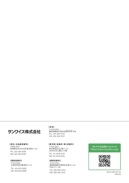 サンワイズ公式ホームページhttps://www.sunwizz.co.jp/【本社】〒424-0204静岡県静岡市清水区興津中町848TEL.054-360-3222FAX.054-360-3227おきつなかちょう【東北・北海道営業所】〒982-0037宮城県仙台市太白区富沢西4-1-16TEL.022-395-8790FAX.022-395-8795【関西営業所】〒564-0051大阪府吹田市豊津町13-15TEL.06-6155-6085FAX.06-6155-6089【東京営業所】〒105-0011東京都港区芝公園1-2-8AMANO芝公園ビル4階TEL.03-3438-0255FAX.03-3438-0256【福岡営業所】〒812-0041福岡県福岡市博多区吉塚8-1-14PANリバーズ6TEL.092-402-1472FAX.092-402-147390210-AOF-007-182024/05
