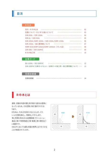 目次R巾木・20R-100AL・50R-55AL目次・R巾木とは抗菌について・RとRFの違いについて20R-60AL40R-AL50R-100AL/50RF-100AL50R-250AL40RP-SUS/50RP-52SUS/50RP-100SUS20R-ABS・35R-100PVCR巾木施工例・施工要領書について・50R-150AL/50RF-150AL(プレス品)台車ガード・DG-100PVCDG-120AL35R-100PVC台車ガードセット・台車ガード施工例・施工要領書について見積依頼書見積依頼書020304050607080910121314R巾木とは通常、部屋の内部の壁と床が接する部分は直角になっているため、その空間に埃が溜まりやすくなります。R巾木は、巾木にRを持たせることにより、そういった空間を無くし、清掃をしやすくします。常に清潔を求められる各種設備(クリーンルーム・食品工場・半導体製造工場・製薬工場・病院など)に最適です。HACCPにおいても壁と床面の境界にはRをつけることが推奨されています。埃溜り壁R巾木壁床床2