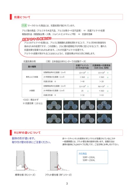 抗菌について抗菌マークのついた商品には、抗菌処理が施されています。アルミ製の商品(アルミR巾木定尺品、樹脂成形品(樹脂製出隅・入隅、抗菌アルマイト処理とは?アルミ台車ガード定尺品等)⇒抗菌アルマイト処理ジョイントエンドキャップ等)⇒抗菌材混練アルミに陽極酸化皮膜処理をすることで、アルミのアルマイト処理とは、高めるための処理ですが、抗菌効果を発揮するものもあります。アルマイト皮膜が剥がれることはほとんどなく、抗菌効果は半永久的に持続します。これが抗菌アルマイト処理です。アルミ形材の耐食性を優れたこの皮膜に、さらに銀の超微粒子を均等に混入させることで、抗菌効果の例((財)日本食品分析センターでの試験データ)菌の種類試験開始時の生菌数(/c㎡)黄色ぶどう球菌24時間後の生菌数(/c㎡)抗菌活性値※試験開始時の生菌数(/c㎡)大腸菌24時間後の生菌数(/c㎡)抗菌活性値※<0.63:検出せず※抗菌効果:2.0以上①⑤②⑥抗菌アルマイト(R巾木定尺品)抗菌樹脂+抗菌塗装(50R-55AL役物)①②③④1.5×104<0.3>4.1.1×10425>3.③⑦⑤⑥⑦⑧1.5×104<0.63>2.9.6×103<0.63>4.④⑧RとRFの違いについて副体の形が違います。取り付け壁の形状にご注意ください。床ベースチャンネルを使用せずにパネルが設置されているところや一般建築壁には、フラット壁仕様の副体を使います。設置方法は通常の副体ビス止めタイプと同じです。ご注文時にお申し付け下さい。対応商品50RFー100AL50RFー150AL標準仕様(Rシリーズ)フラット壁仕様(RFシリーズ)3
