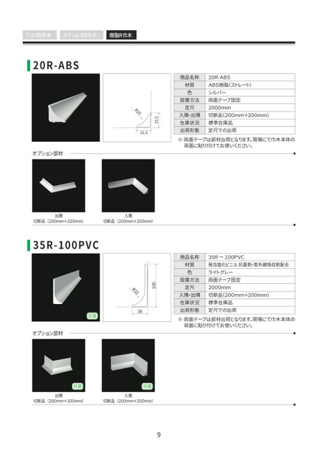 商品名称材質色設置方法定尺入隅・出隅在庫状況出荷形態20R-ABSABS樹脂(ストレート)シルバー両面テープ固定2000mm切断品(200mm+200mm)標準在庫品定尺での出荷※両面テープは部材出荷となります。現場にて巾木本体の背面に貼り付けてお使いください。15.515.5R20アルミR巾木ステンレスR巾木樹脂R巾木20R-ABS商品名称材質色設置方法定尺入隅・出隅在庫状況出荷形態35Rー100PVC発泡塩化ビニル抗菌剤・紫外線吸収剤配合ライトグレー両面テープ固定2000mm切断品(200mm+200mm)標準在庫品定尺での出荷※両面テープは部材出荷となります。現場にて巾木本体の背面に貼り付けてお使いください。出隅(200mm+200mm)切断品入隅(200mm+200mm)切断品35R-100PVC100R35抗菌36オプション部材抗菌抗菌出隅(200mm+200mm)切断品入隅(200mm+200mm)切断品9オプション部材