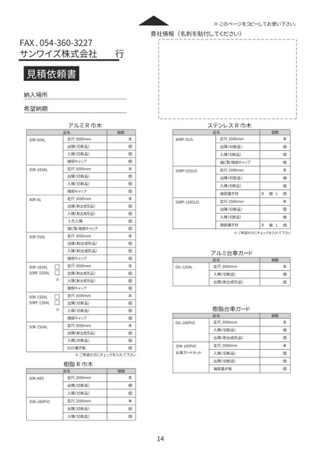 本個個個本個個本個個R個L個R個L個定尺2000mm出隅(切断品)入隅(切断品)塩ビ製端部キャップ定尺2000mm出隅(切断品)入隅(切断品)端部塞ぎ材定尺2000mm出隅(切断品)入隅(切断品)端部塞ぎ材※ご希望の方にチェックを入れて下さいアルミ台車ガード品名定尺3000mm入隅(切断品)出隅(射出成形品)樹脂台車ガード品名定尺2000mm入隅(切断品)出隅(射出成形品)定尺2000mm入隅(切断品)出隅(切断品)端部塞ぎ板個数個数本個個本個個本個個個40RP-SUS50RP-52SUS50RP-100SUSDG-120ALDG-100PVC35R-100PVC台車ガードセット貴社情報(名刺を貼付してください)※このページをコピーしてお使い下さい。FAX.054-360-3227サンワイズ株式会社行見積依頼書アルミR巾木品名個数ステンレスR巾木品名個数本個個個本個個個本個個個個本個個個本個個個本個個個本個個個定尺3000mm出隅(切断品)入隅(切断品)端部キャップ定尺3000mm出隅(切断品)入隅(切断品)端部キャップ定尺3000mm出隅(射出成形品)入隅(射出成形品)3方入隅塩ビ製端部キャップ定尺3000mm出隅(射出成形品)入隅(射出成形品)端部キャップ定尺3000mm出隅(射出成形品)入隅(射出成形品)端部キャップ定尺3000mm出隅(切断品)入隅(切断品)端部キャップ定尺3000mm出隅(射出成形品)入隅(切断品)SUS塞ぎ板納入場所希望納期20R-60AL20R-100AL40R-AL50R-55AL50R-100AL50RF-100AL50R-150AL50RF-150AL50R-250AL※※14※ご希望の方にチェックを入れて下さい本個個本個個個数20R-ABS35R-100PVC樹脂R巾木品名定尺2000mm出隅(切断品)入隅(切断品)定尺2000mm出隅(切断品)入隅(切断品)